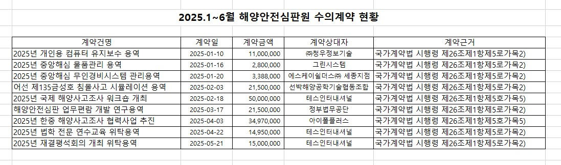 2025년 상반기. 중앙해양안전심판원 수의계약 체결현황을 알려드립니다.(세부내용은 붙임 참고) |