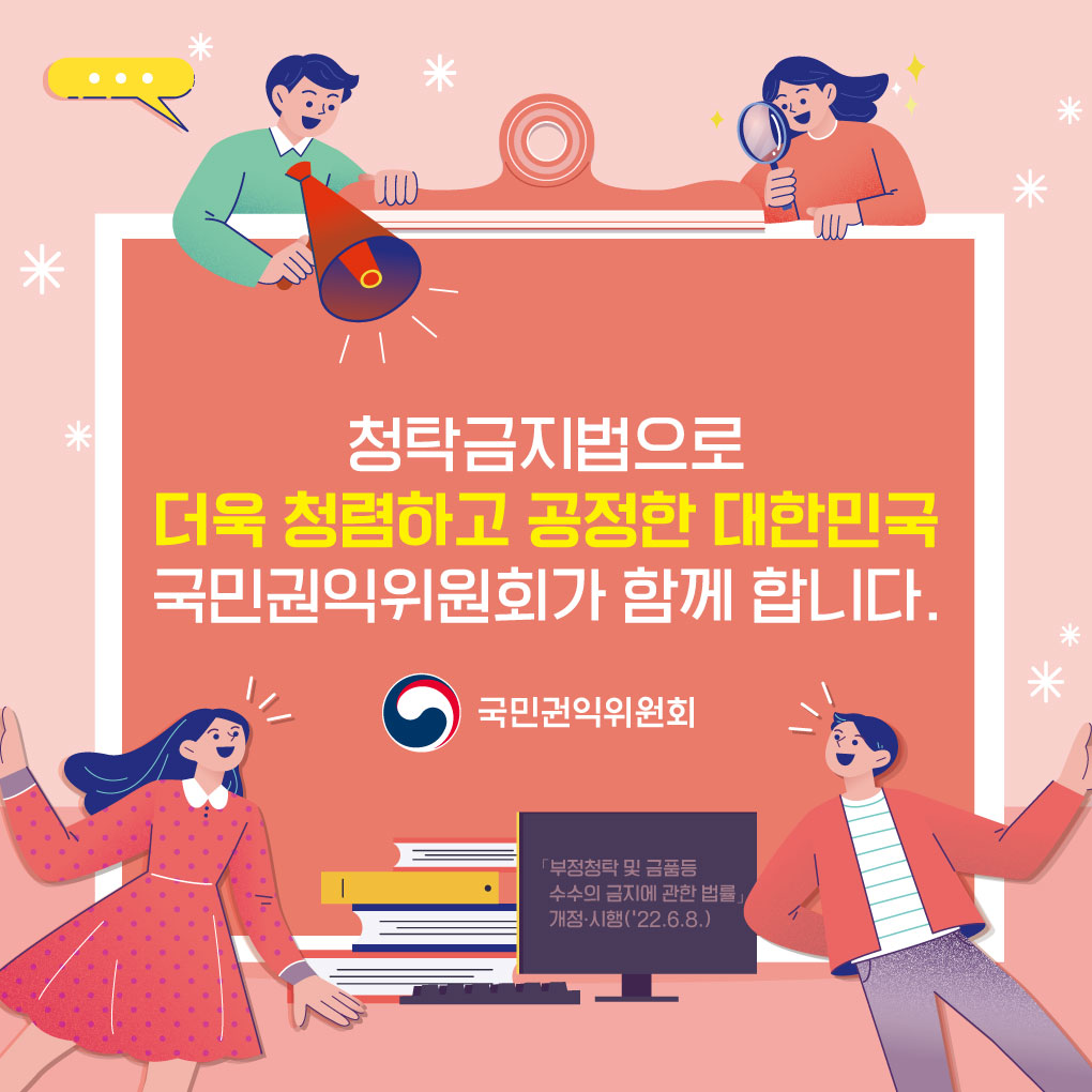 국민권익위원회로부터 「부정청탁 및 금품등 수수의 금지에 관한 법률」(법률 제18567호, 2022.6.8. 시행) 개정사항을 아래 카드뉴스와 같이 알려드리니 업무에 참고하시기 바랍니다.